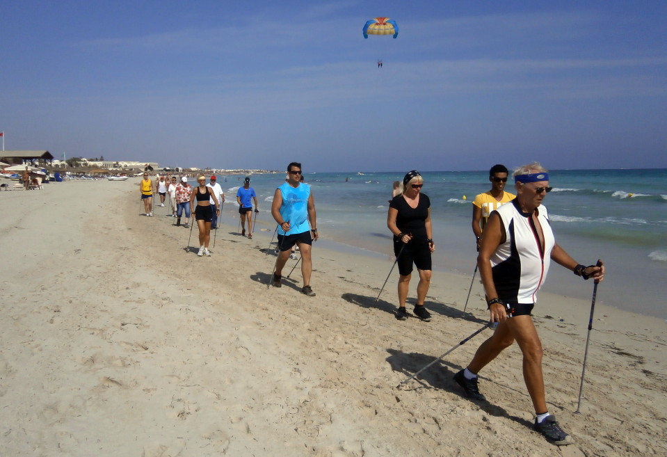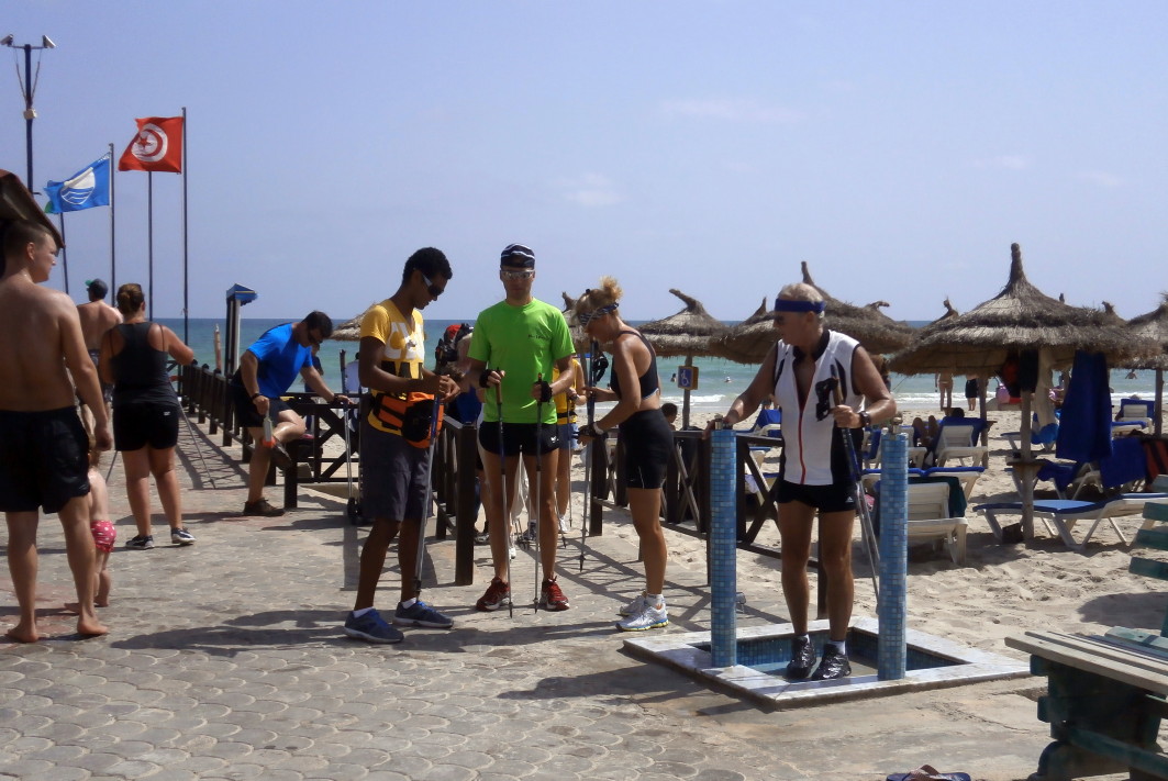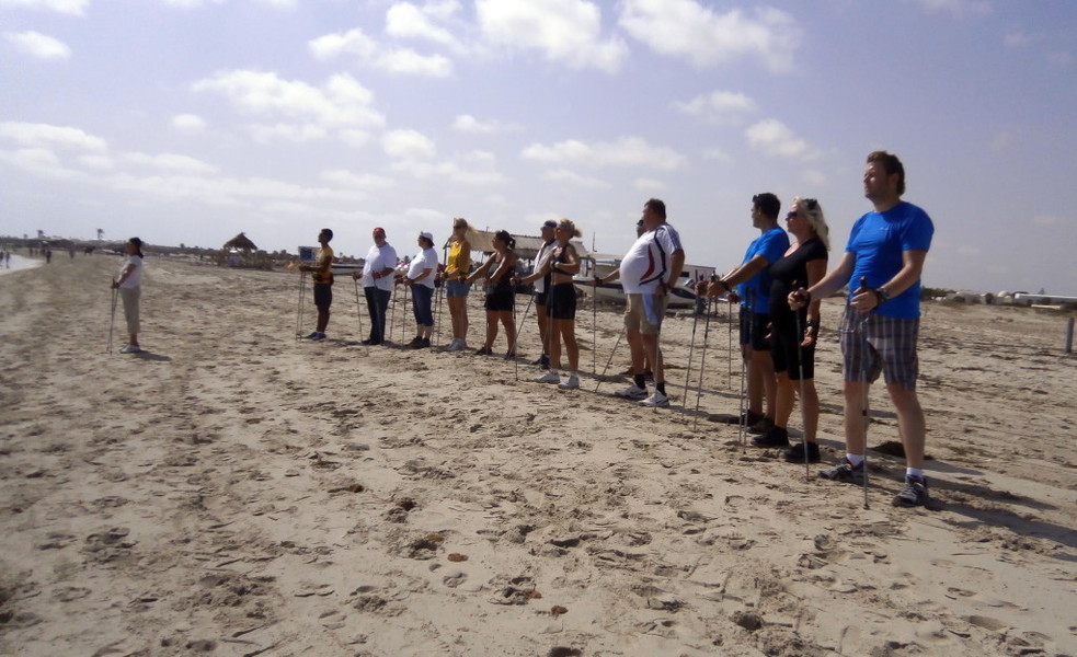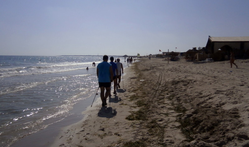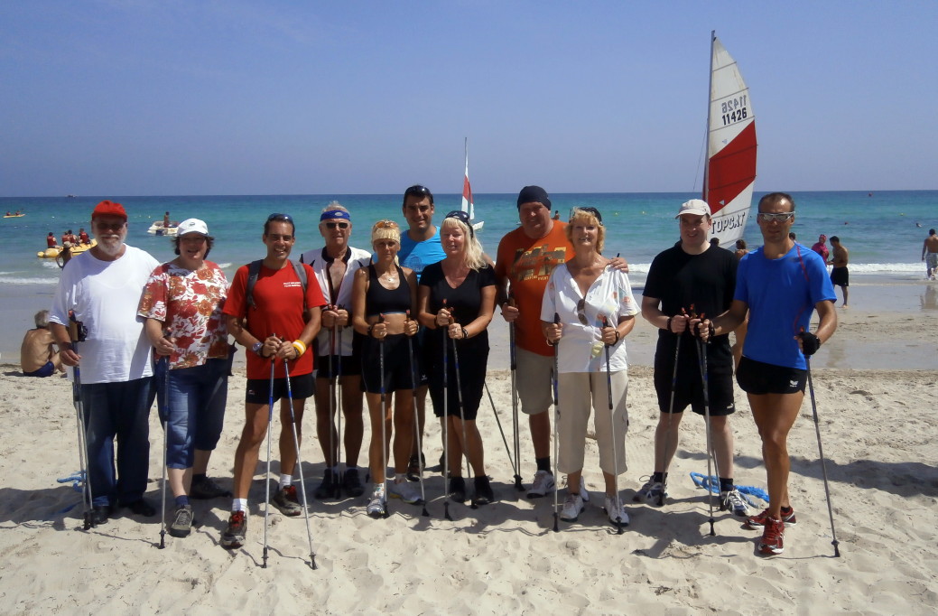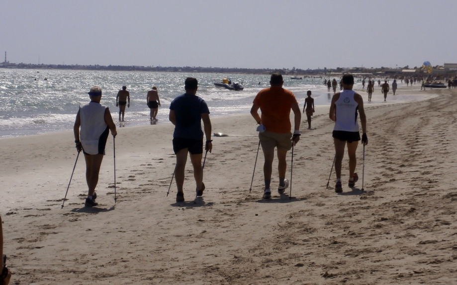 Wie bei allen Nordic Walking Events auf Djerba wurde das Training am Strand durchgeführt. Leider wurde durch Aufschüttungen der noch im Frühjahr herrlich flache Strand für uns Walker etwas "verunstaltet". Die vielen Pferd- & Kameltreiber, Tuch- und Sonstiges-Verkäufer, machten uns das Walken schwerer als gewohnt. Dennoch: Trotz Hitze und hoher Luchtfeuchtigkeit waren unsere Gäste mit großer Begeisterung dabei.